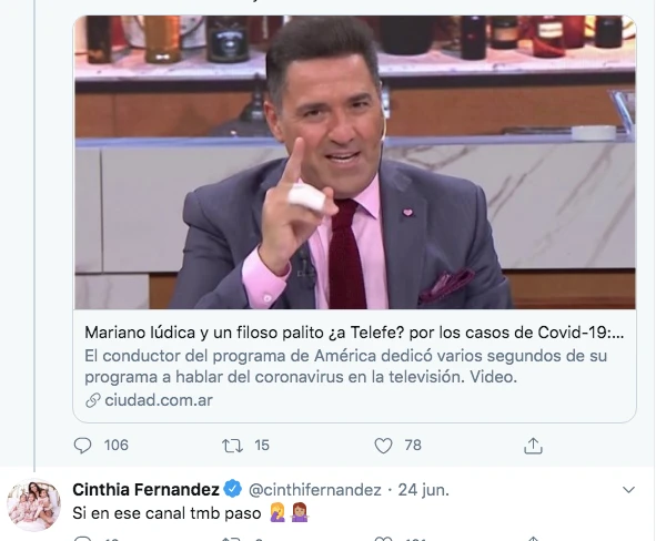 Rápida de reflejos, la modelo y bailarina hizo mención a esas palabras y soltó su latigazo. "Pero si en ese canal también pasó" le retrucó Cinthia, actual panelista del programa El show del problema, desde su cuenta de Twitter, donde la siguen 1.900.000 personas.