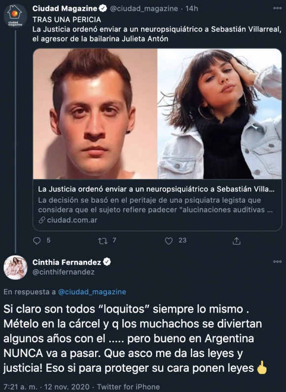 Cinthia Fernández no pudo disimular su indignación, como una enorme porción de la sociedad, y se expresó con vehemencia en su cuenta de Twitter. La mediática se posó en una noticia que se titulaba "Tras una pericia, la Justicia ordenó enviar a un neuropsiquiátrico a Sebastián Villarreal, el agresor de la bailarina Julieta Antón" y opinó con dureza.
