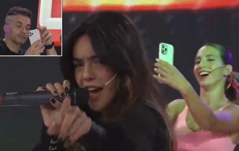 El periodista, por su parte, se sentó en una de las sillas de sus compañeras y, desde allí, transmitió para sus redes sociales e hizo fotos de la presentación en vivo de la cantante.