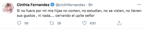 Asimismo, Cinthia volvió a remarcar que es ella quien se encarga de la crianza de sus hijas, tanto presencial como económicamente, y le pidió de mala manera que dejara de comentar ese tipo de cosas: “Si no fuera por mí, mis hijas no comen, no estudian, no se visten, no tienen sus gustos ni nada… Cerrando el upite señor".
