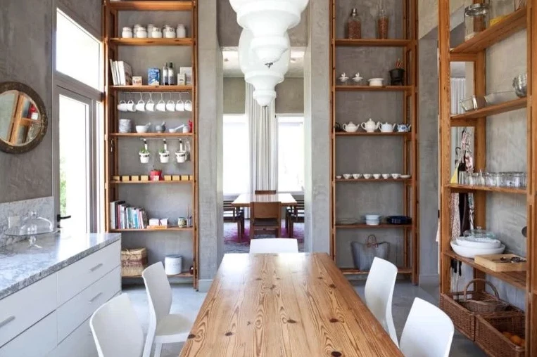 Asimismo, la amplísima cocina de la actriz cuenta con varios estantes de madera que utiliza para guardar vajilla de cerámica, un mini comedor con mesa de madera y sillas blancas de plástico.