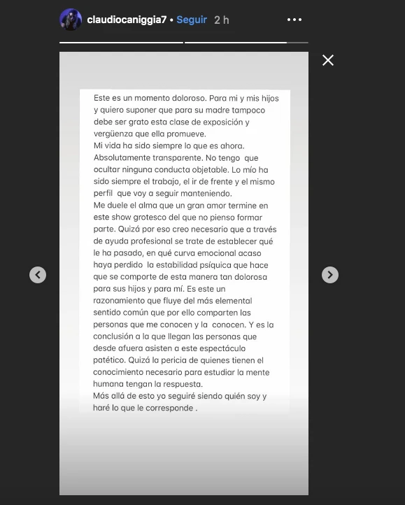 Y si algo faltaba a esta problemática familiar era la palabra del Pájaro Caniggia. El deportista eligió Instagram para defenderse de las acusaciones de su ex mujer. Hace instantes publicó una Storie con un fuerte descargo: