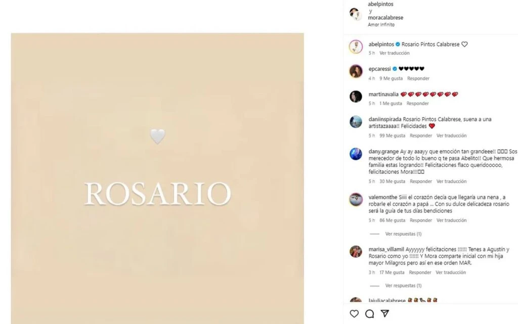 El posteo no es muy profundo, solo colocó una imagen donde sale el nombre de la bebé. Rosario, se puede leer en grande. Junto a la foto, el músico y Mora Calabrese escribieron el nombre completo de su hija por nacer, Rosario Pintos Calabrese.