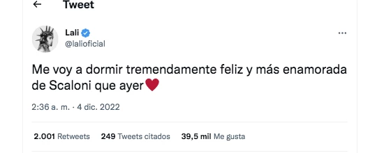 Conmovida por ese apoyo descomunal, Lali saltó a Twitter para expresar todo lo que corre por su sangre y en ese contexto soltó una revelación impensada, que refiere a una química singular que le despierta Lionel Scaloni, el director técnico del seleccionado.