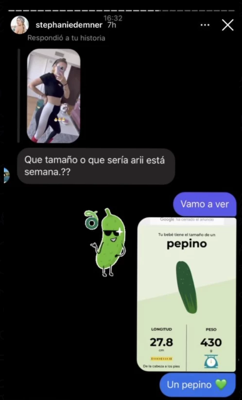 Té de jengibre mediante y luego de cancelar por ese malestar una charla que iba a dar con su socia en el Alto Avellaneda, Stephanie mostró algunos mensajes directos que intercambió con otras embarazadas o ya madres con experiencia y fue una de ellas que le consultó, al ver el crecimiento de su panza, que tamaño calcula que y atiene su beba.