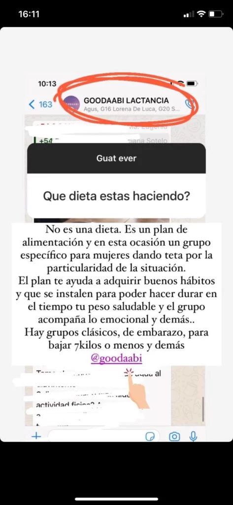 Y agregó: “Que se instalen para poder hacer durar en el tiempo tu peso saludable, y el grupo acompaña lo emocional y demás. Hay grupos clásicos, de embarazo, para bajar 7 kilos o menos, y demás”. En esa misma historia Juana acompañó la información con una captura del chat grupal que integra llamado Goodaabi Lactancia.