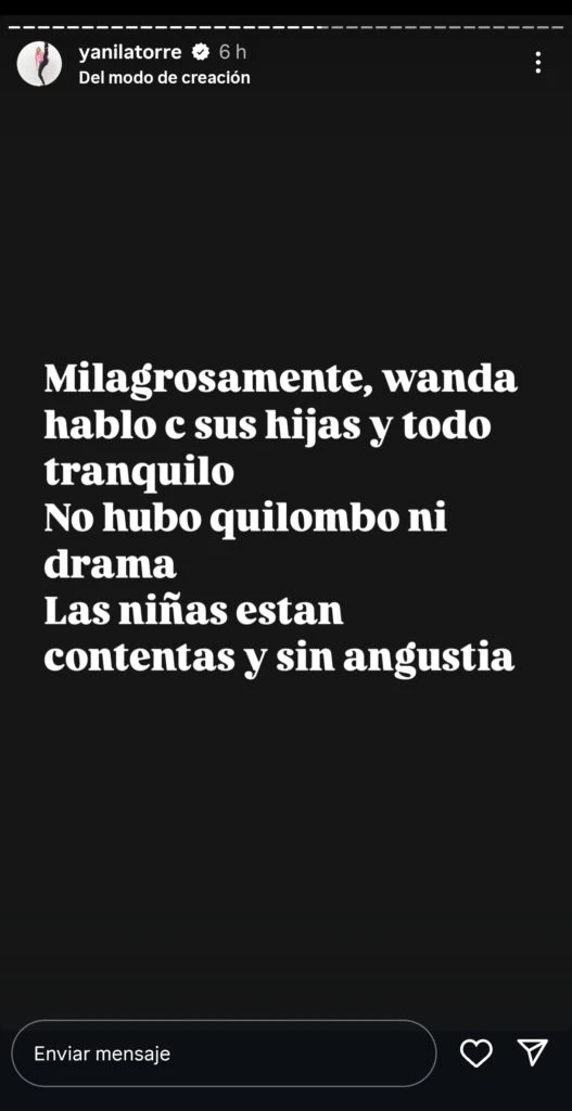 Pese al clima de incertidumbre, todo parece haberse desarrollado con cierta calma. “Por ahora todo tranquilo. O sigue así y es todo felicidad… o ya están pergeñando algún plan o denuncia macabra. Milagrosamente, Wanda habló con sus hijas y todo tranquilo. No hubo ni drama. Las niñas están contentas y sin angustias”, detalló sobre el accionar de la China.