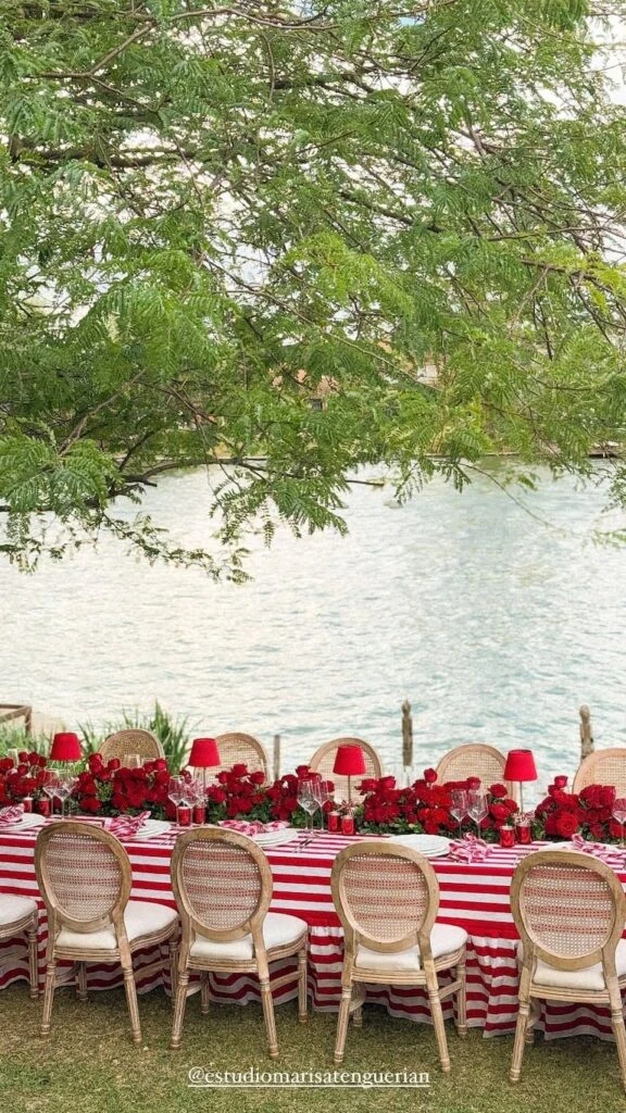 La mesa es la que cenaron se encontraba a las orillas de un río. Además, la decoración que hicieron fue con temática navideña, obviamente. Un mantel de color rojo y blanco, junto a centros de mesas con rosas. También había unas pequeñas lámparas de color rojo a lo largo de la mesa.