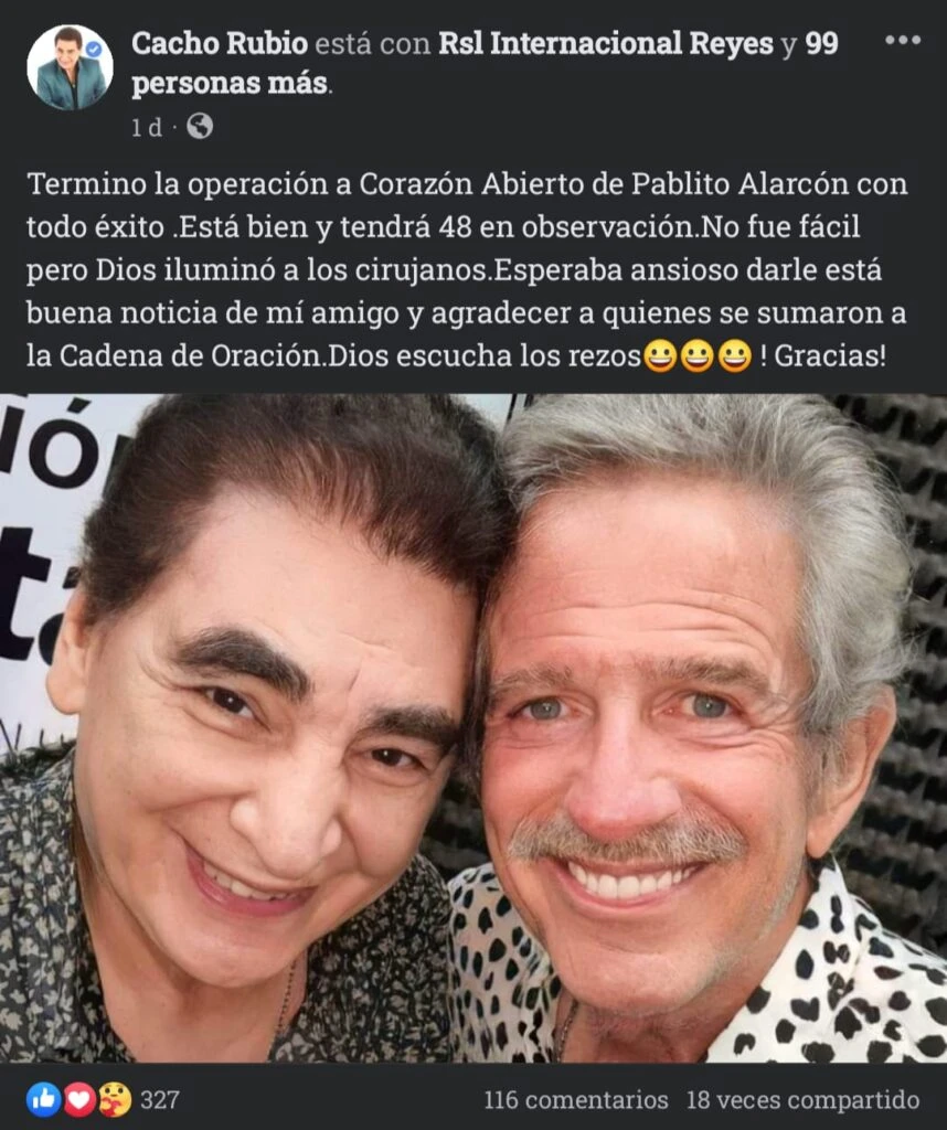 Por su parte, el reconocido Cacho Rubio, habló sobre el estado de salud de su amigo e informó la buena noticia tras la operación: "No fue fácil, pero Dios iluminó a los cirujanos. Esperaba ansioso darle esta noticia a mi amigo y agradecer a quienes se sumaron a la cadena de oración. Dios escucha sus rezos, gracias".