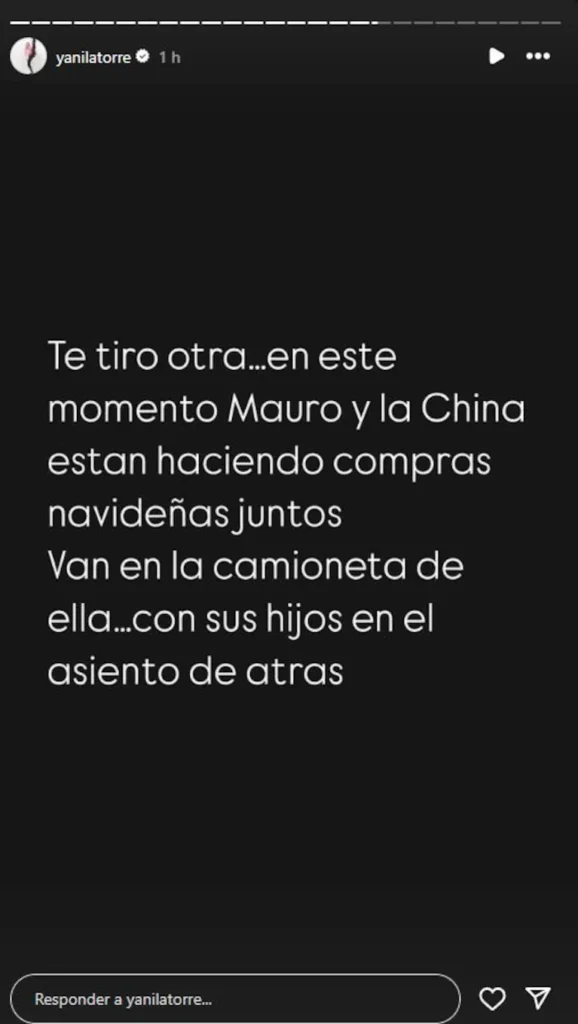Con respecto a la información que tenía Yanina Latorre, la angelita fue contundente con su declaraciones y escribió en Instagram: “Te tiro otra. En este momento, Mauro y La China están haciendo compras navideñas juntos. Van en la camioneta de ella, con sus hijos en el asiento de atrás”.
