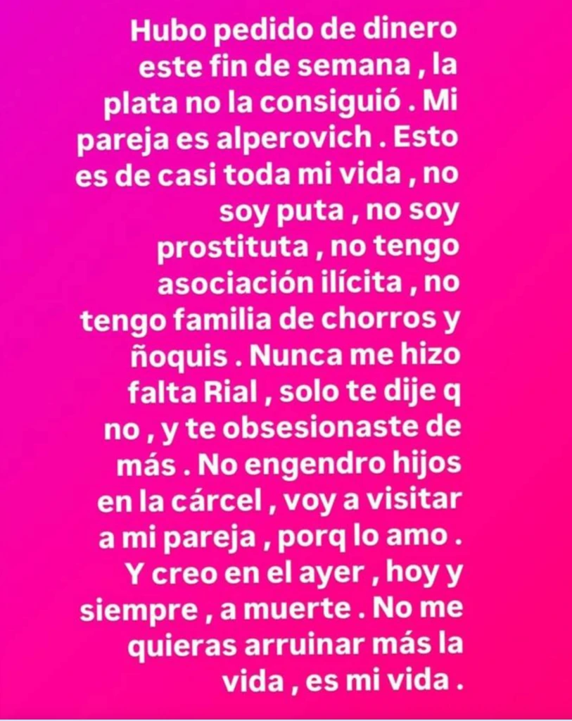 "Hubo pedido de dinero este fin de semana, la plata no la consiguió. Esto es de casi toda mi vida, no soy p…, no soy prostituta, no tengo asociación ilícita, no tengo familia de chorros y ñoqis. Nunca me hizo falta Rial, solo te dije que no, y te obsesionaste de más". Escribió Mirra.