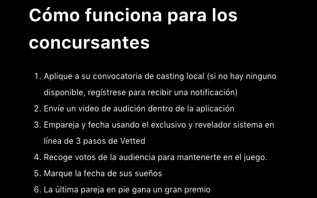 El casting para participar del reality se llevará a cabo en Argentina durante la primera semana de noviembre. Serán 30 las personas elegidas (15 hombres y 15 mujeres) para participar del programa. De todos los matches y conversaciones que surjan del reality, habrá tres parejas finalistas que van a tener una cita real. La misma va a subir a Vetted para que la comunidad pueda decidir cuál de las parejas es su favorita para que ganen los dos millones de pesos.