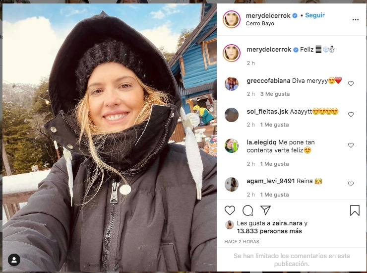 En todo este contexto, la modelo armó las valijas, preparó todo lo necesario para sus dos hijas y se zambulló en un viaje con Meme a la Patagonia. Mery compartió varios contenidos de unas vacaciones familiares en Cerro Bayo, con la nieve como protagonista.