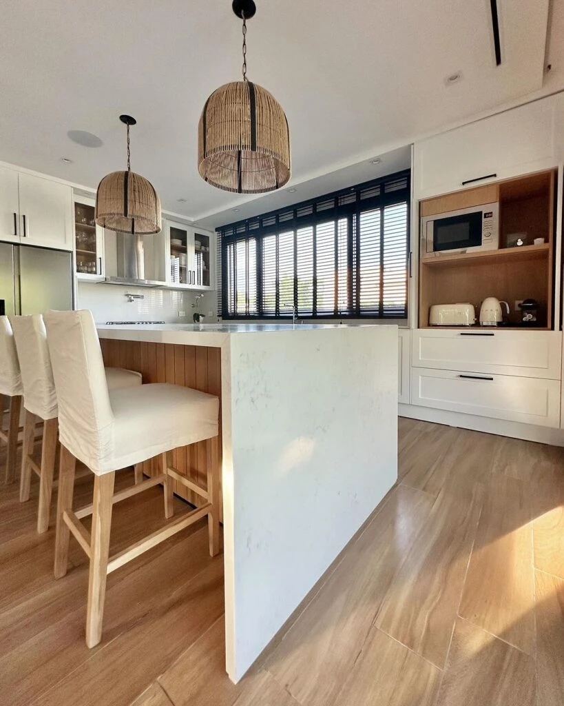 Pisos de porcelanato que simulan la textura de la madera, isla de mármol, muebles blancos e impolutos y mesadas en el mismo tono son el alma de esta cocina en la que las banquetas y las lámparas rústicas pero elegantes suman su toque personal.