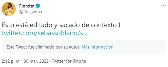 “Esto está editado y sacado de contexto”, escribió furiosa Flor en su cuenta de Twitter citando la nota que compartieron desde Infobae con un titular que generó más de una burla y una cita bomba: “No había descubierto nada del sexo”. Fue entonces que decidieron bajar la nota de la red social del pajarito.