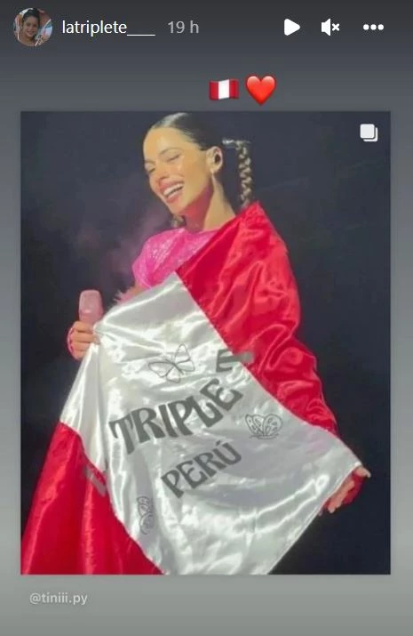 Después de brindar un show en Perú, la Triple T se limitó a compartir en las historias de sus dos cuentas de Instagram y en la red del pajarito distintos momentos de la noche. La novia de Rodrigo De Paul publicó la euforia de sus fans, destacó lo bien que la pasó y se mantuvo en silencio sobre sus progenitores.