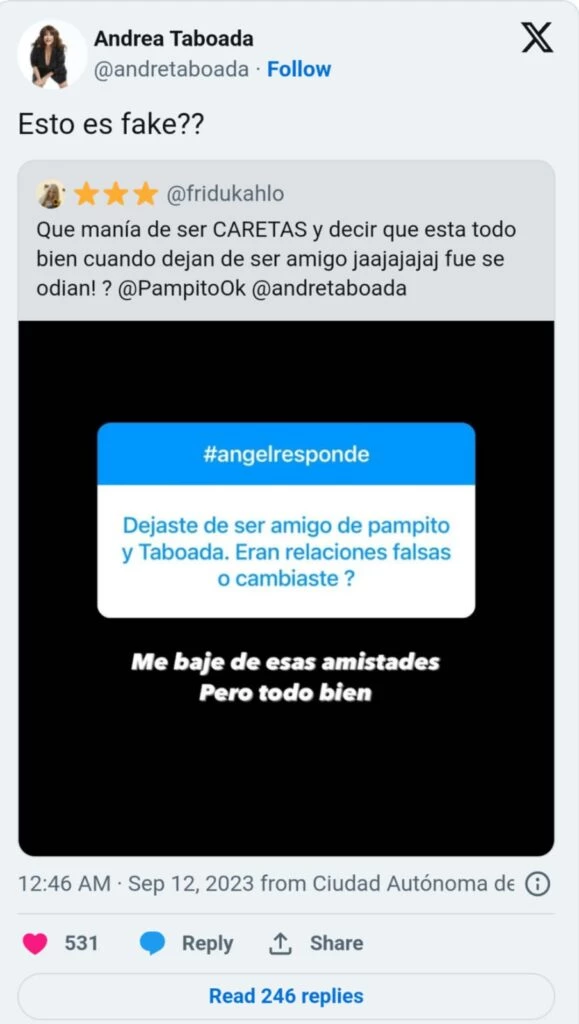 Un seguidor, de manera picante, comentó: "Ángel anoche se reencontró con Taboada y fingieron demencia ambos". A lo que Andrea respondió de manera tajante: "Nos encontramos de casualidad (yo estaba en otra mesa con amigas). ¡Yo lo fui a saludar! Nunca fingí demencia porque básicamente no tengo por qué hacerlo!! ¿Acaso él dijo algo de mí? Besos".