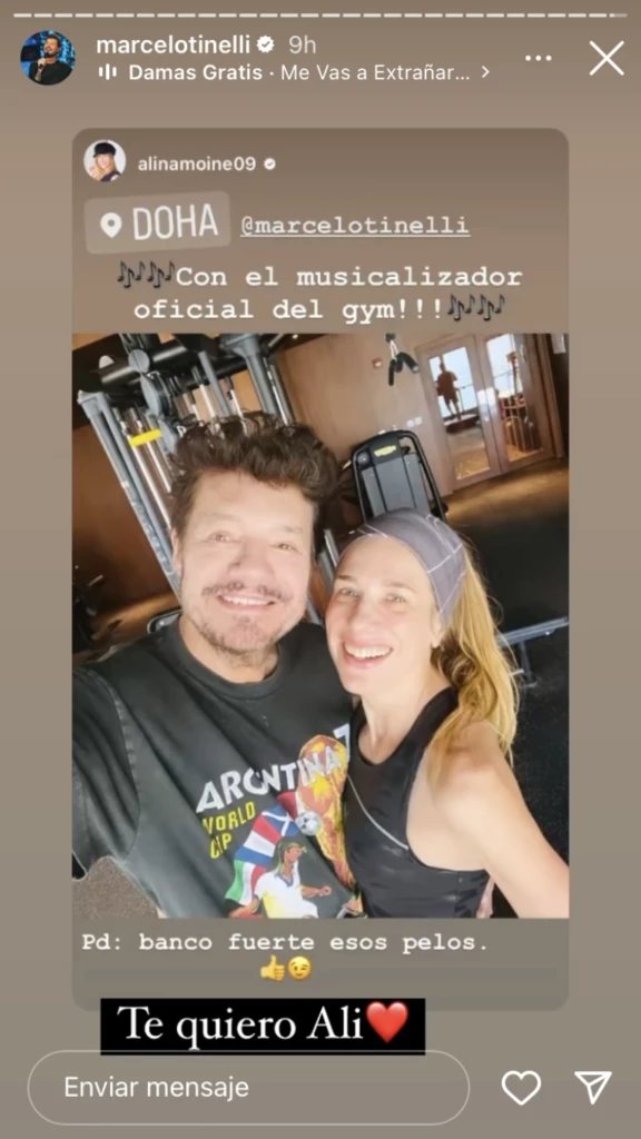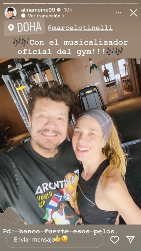 De esta manera acordaron tras un parate en el trabajo de la conductora, encontrarse en el fantástico gimnasio que ofrece el edificio. Allí Marcelo sacó una selfie y fue Alina Moine quien la subió: "Con el musicalizador oficial del gym", puso ella en su historia. Luego agregó: "PD: Banco fuerte esos pelos", haciendo alusión al pelo de Tinelli.
