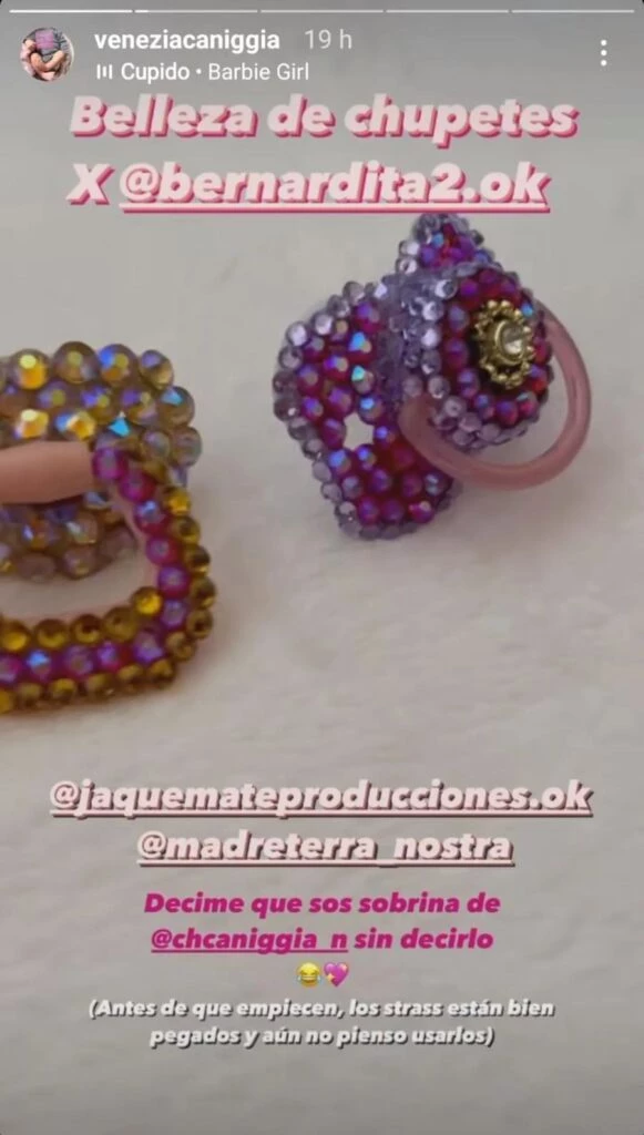 La bailarina subió un video en que se veían dos chupetes cubiertos por completo con cristales Swarovski en tonos rosados y amarillos.