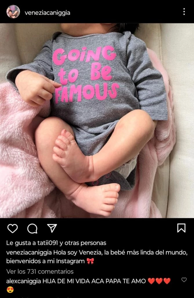 Sin embargo esto no impidió que le crearan una cuenta en donde no mostraran su rostro, pero muestren su día a día. La nieta de Mariana Nannis ya acumula 90 mil seguidores, y tiene una publicación con un body en el cual afirma que va a ser famosa. Su papá no pudo contenerse y le comentó en mayúsculas: "Hija de mi vida acá papá te amo" junto a corazones y caritas de enamorado.