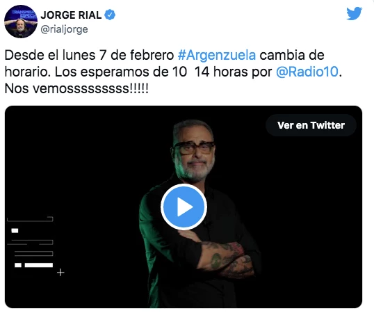 A través de su cuenta de Twitter, el medio virtual que más le gusta usar al ex conductor de Intrusos en el espectáculo, anunció que el próximo 7 de febrero ( es decir, a partir del lunes), Argenzuela, su programa por Radio 10 cambia de horario.