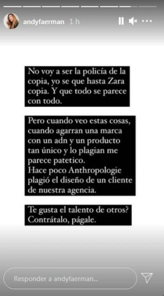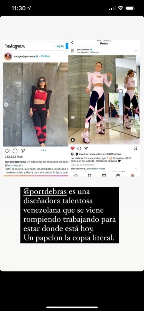 "Portdebras es una diseñadora talentosa venezolana que se viene rompiendo trabajando para estar donde está hoy. Un papelón la copia literal. No voy a ser la policía de la copia, yo se que hasta Zara copia. Y que todo se parece con todo. Pero cuando veo estas cosas, cuando agarran una marca con un adn y un producto tan único y lo plagian, me parece patético. ¿Te gusta el talento de otros? Contratalo, pagale", siguió Faerman.
