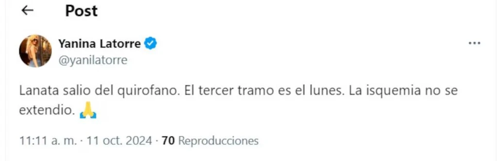 “Lanata salió del quirófano. El tercer tramo es el lunes. La isquemia no se extendió”, publicó la panelista de LAM. Cabe destacar que al periodista le practicaron una inspección intestinal para saber cómo evoluciona a la operación del 9 de octubre. En este contexto, la cirugía se completaría este lunes si la salud lo permite.