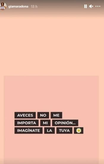 Gianinna escribió en una storie una frase muy descriptiva de lo que se siente por las críticas, una declaración de su postura ante los cuestionamientos. "A veces no me importa mi opinión... Imaginate la tuya", publicó la hermana de Dalma.