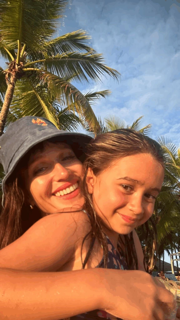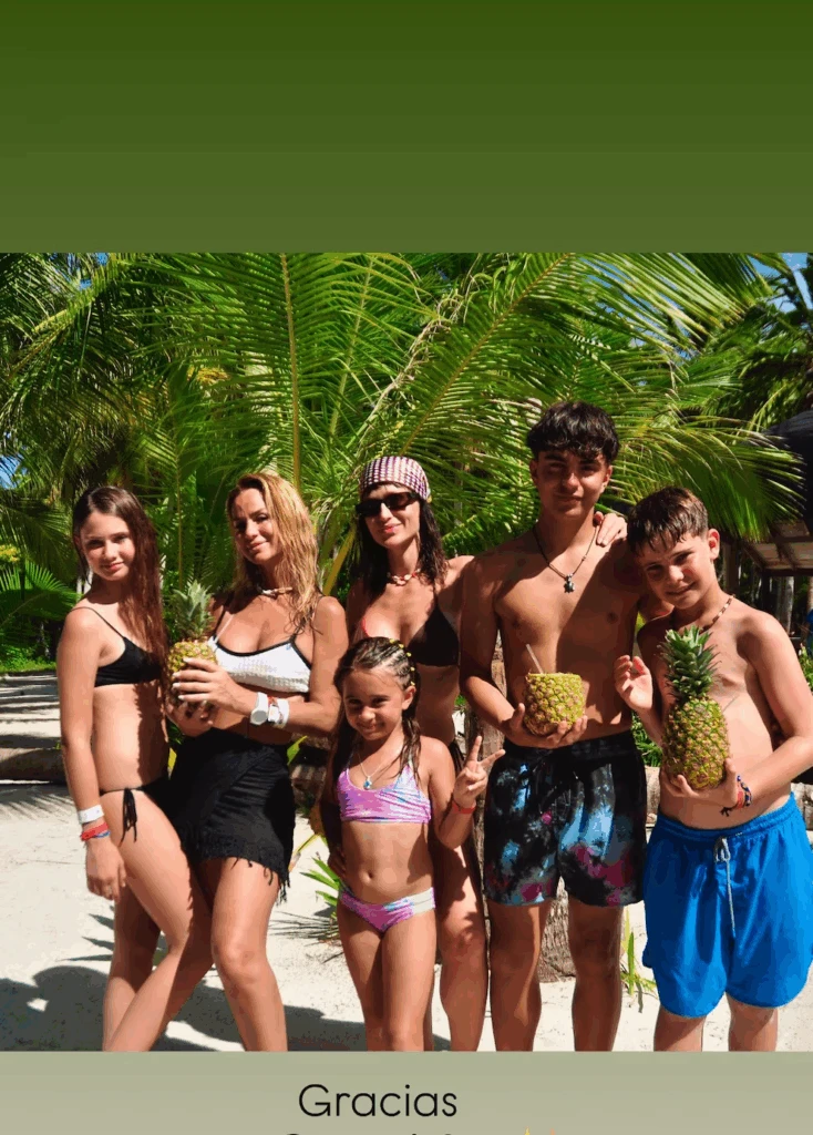 Ambas familias compartieron largas jornadas de playa, comidas típicas y caminatas al atardecer. En una de las postales más alegres, todos posaron sobre la arena, sosteniendo ananás y sonriendo bajo el sol. Las imágenes reflejaron la unión entre los chicos y el cariño entre las madres.