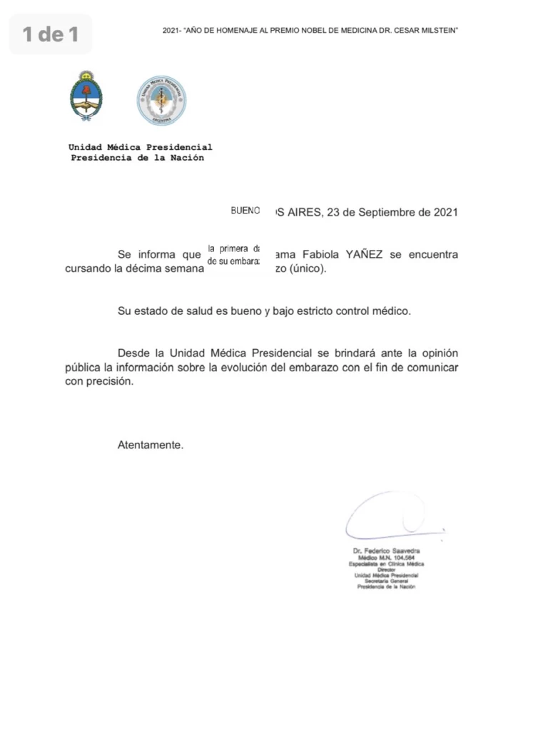 "La primera dama Fabiola Yáñez se encuentra cursando la décima semana de su embarazo (único)". El escrito agrega que "su estado de salud es bueno y bajo estricto control médico".
