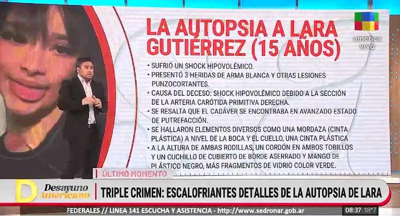 En la presentación del caso que hicieron en Desayuno Americano, programa de América, el shock fue total a la hora de explicarlo: “Es un hecho atroz. A Lara la hicieron ver cómo mataban a sus amigas, a Brenda y a Morena”.