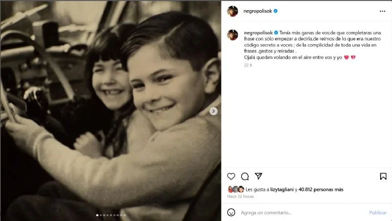 Con el dolor a flor de piel, agregó: “De la complicidad de toda una vida en frases, gestos y miradas. Ojalá queden volando en el aire entre vos y yo”. Sus palabras reflejaron la intimidad y los lazos que, más allá de la partida, seguirán vivos en su memoria.
