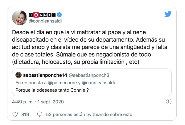 Y de las que opinó sin filtro sobre la heredera de Bartolomé Mitre fue la periodista (hoy dedicada a la consultoría) Connie Ansaldi. En su cuenta de Twitter, ella respondió una duda de un seguidor. “¿Por qué la odias tanto, Connie?”, le preguntó un muchacho.