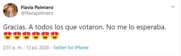 ''Y un domingo gris te encuentras q no todo esta perdido. Ya que nunca fui la reina de la primavera, me toca esto. Amo. Es genial. Gracias. A todos los q votaron!!!'', escribió Flavia expresó la actriz en agradecimiento al premio que le otorgaron.