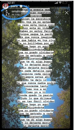“Cuanta poesía que escribían nuestros cuerpos, quién la escribirá si vos ya no estás. La casa está vacía como hoy está mi vida”, arrancó Coti en su storie de Instagram, con la que activó todas las alarmas, direccionó la atención de todo el universo del espectáculo.