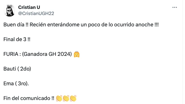 “Buen día. Recién enterándome un poco de lo ocurrido anoche. Final de 3!! FURIA: (Ganadora GH 2024), Bauti (2do) Enma (3ro). Fin del comunicado”, expresó Cristian U, quien causó un enorme revuelo en sus redes.