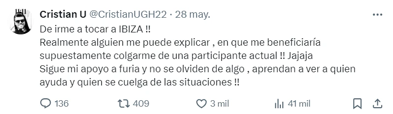 Luego, Cristian explicó porqué banca a Furia: “Solo me gustaría que gane quien fue protagonista de esta edición y quien generó contenido las 24 hs, de eso se trata GH. Muchos estupid@s diciendo ´se quiere colgar´. ¿De qué? Yo estoy cumpliendo mi sueño en otro continente que no se ve GH Argentina y a una semana de irme a tocar a Ibiza”.