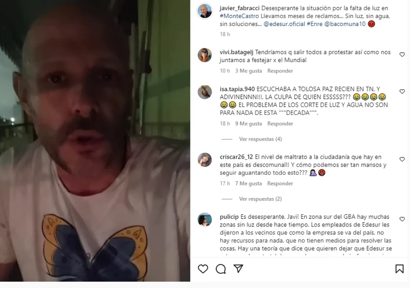 “Acá estamos cenando en el balcón a la luz de las velas, no es por romanticismo sino porque seguimos sin luz. Algunos vecinos tienen, pero somos un montón los que no tenemos”, compartió Javier, luego de tener que improvisar una cena que estuvo lejos de ser romántica, en su cuenta de Instagram, bajo una publicación que tituló: "sin luz, sin agua y sin soluciones".