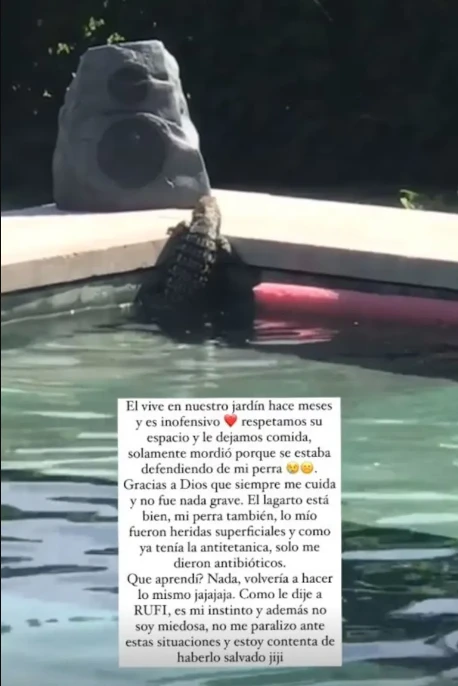 Después de explicar que el reptil la había atacado cuando intentó separarlo de una pelea con su perra, la artista indicó: “Él vive en nuestro jardín hace meses y es inofensivo. Respetamos su espacio y le dejamos comida, solamente mordió porque se estaba defendiendo de mi perra”.