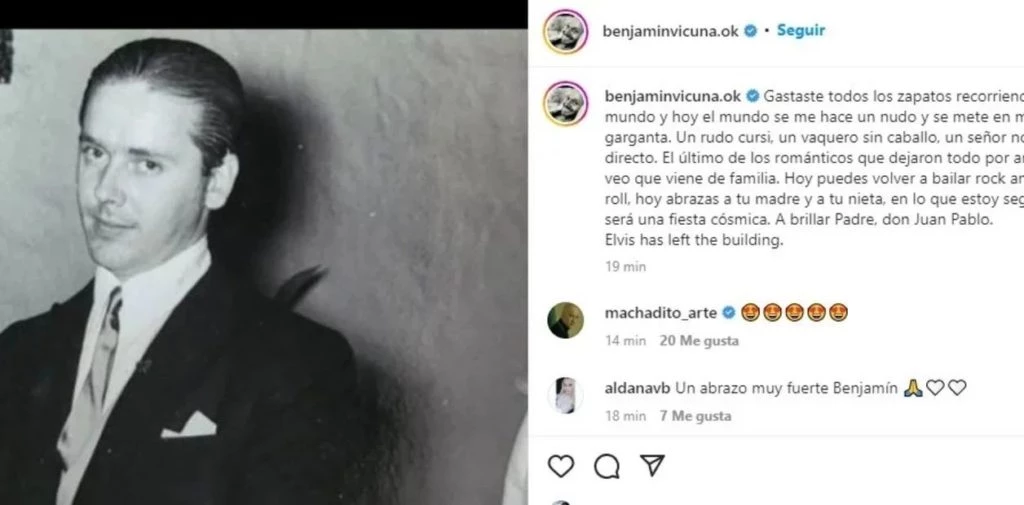 Benjamín Vicuña transita uno de los momentos más tristes de su vida. Este martes 6 de septiembre le dijo adiós a su padre Juan Pablo - quién murió a los 80 años- luego de haber estado dias internado en grave estado. El actor decidió escribirle unas emocionantes palabras en su Instagram y el post causó un gran impacto como cada una de sus publicaciones.