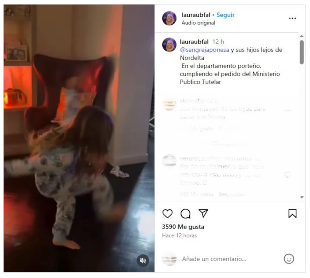 “@sangrejaponesa y sus hijos, lejos de Nordelta en el departamento porteño, cumpliendo el pedido del Ministerio Público Tutelar”, escribió Ubfal en Instagram. En las imágenes se puede ver a Magnolia y Rufina, hijas de la China con Benjamín Vicuña y Nicolás Cabré, jugando tranquilamente en el living.
