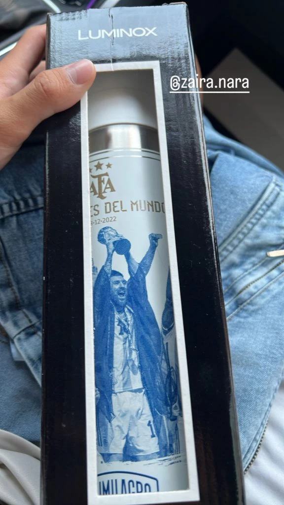Sin embargo el termo que su tía le regalo tiene grabado los colores celestes y blancos y también a Lionel Messi en el momento justo donde levanta la Copa del Mundo, también posee las tres estrellas junto al logo de la AFA y la fecha de la final que fue el dieciocho de diciembre del año pasado.