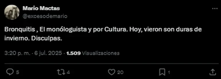 “Bronquitis, El monologuista y por cultura. Hoy, vieron son duras de invierno. Disculpas”, escribió días antes de morir. El mensaje, que en su momento pasó casi desapercibido, tomó una fuerza emocional enorme tras la confirmación de su fallecimiento.