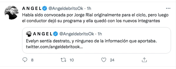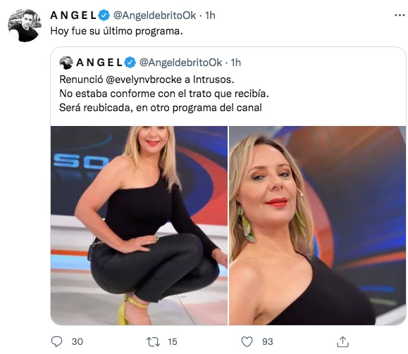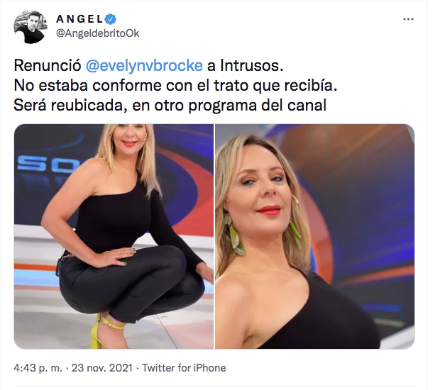 “Renunció @evelynvbrocke a Intrusos. No estaba conforme con el trato que recibía. Será reubicada en otro programa del canal”, aseguró el conductor de LAM, el programa de la misma temática con la que Intrusos compite a diario, sobre la realidad de la periodista que no puede viajar a Holanda a ver a su hija.