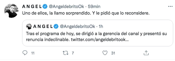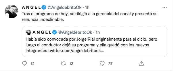 Y ante la incomodidad laboral en el programa que conducen Adrián Pallares y Rodrigo Lussich, Von Brocke decidió presentar su renuncia al programa ante las autoridades de la emisora. Fue Ángel De Brito, con quien la periodista trabajó años atrás, quien lo anunció a través de su cuenta de Twitter.