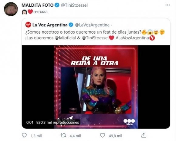 Utilizando la publicación que realizó el sitio oficial de La Voz, en donde mostró el clip del beso de la jurado a Tini, la exprotagonista de Violetta lo copió en Twitter y encima escribió agradecida: “Reinaaa”. También, agregó el emoji de un corazón rojo y el rostro de una mujer con una corona en su cabeza.