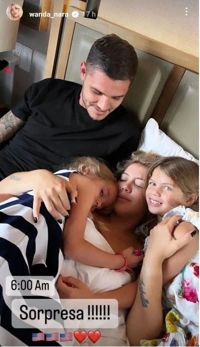Junto a una foto donde se la ve a Wanda acostada y abrazada junto a sus dos hijas con Mauro Icardi apreciando el momento, Nara escribió emocionada: "6:00 am. Sorpresa". La famosa contó que se encuentra muy emocionada y expresó: "Esos sueños que decís que son tan imposibles que ni soñando podés creerlos".