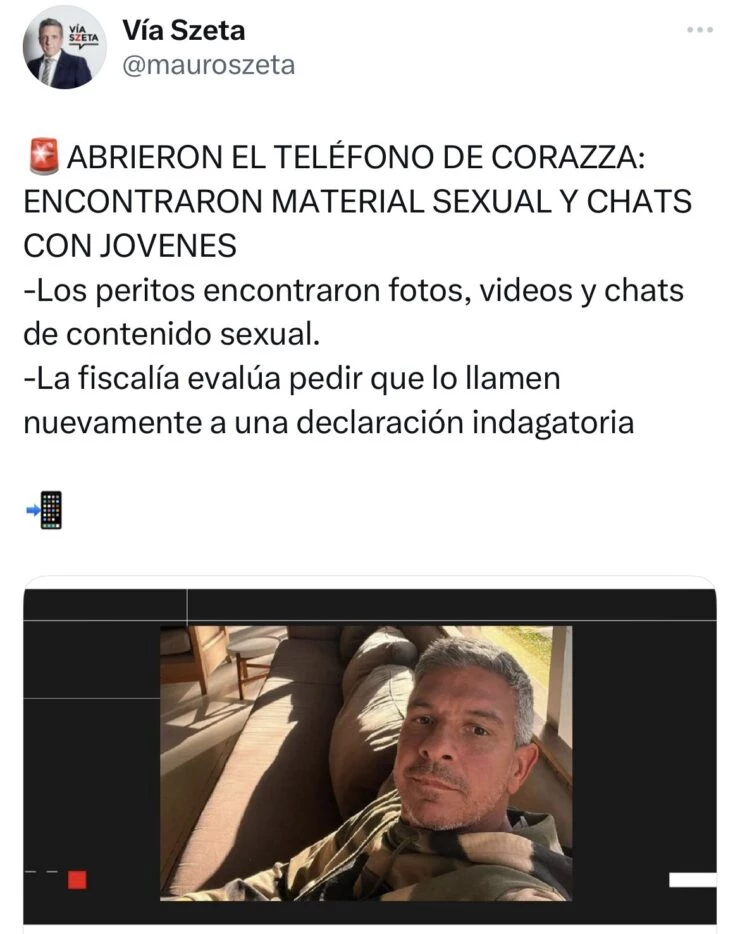 El caso sorprendió tanto en los medios que varios periodistas lo han seguido a sol y sombra; en este caso fue Mauro Szeta quien publicó en Twitter los archivos que lo implicaron: ABRIERON EL TELÉFONO DE CORAZZA: ENCONTRARON MATERIAL SEXUAL Y CHATS CON JÓVENES. Los peritos encontraron fotos, videos y chats de contenido sexual. La fiscalía evalúa pedir que lo llamen nuevamente a una declaración indagatoria"