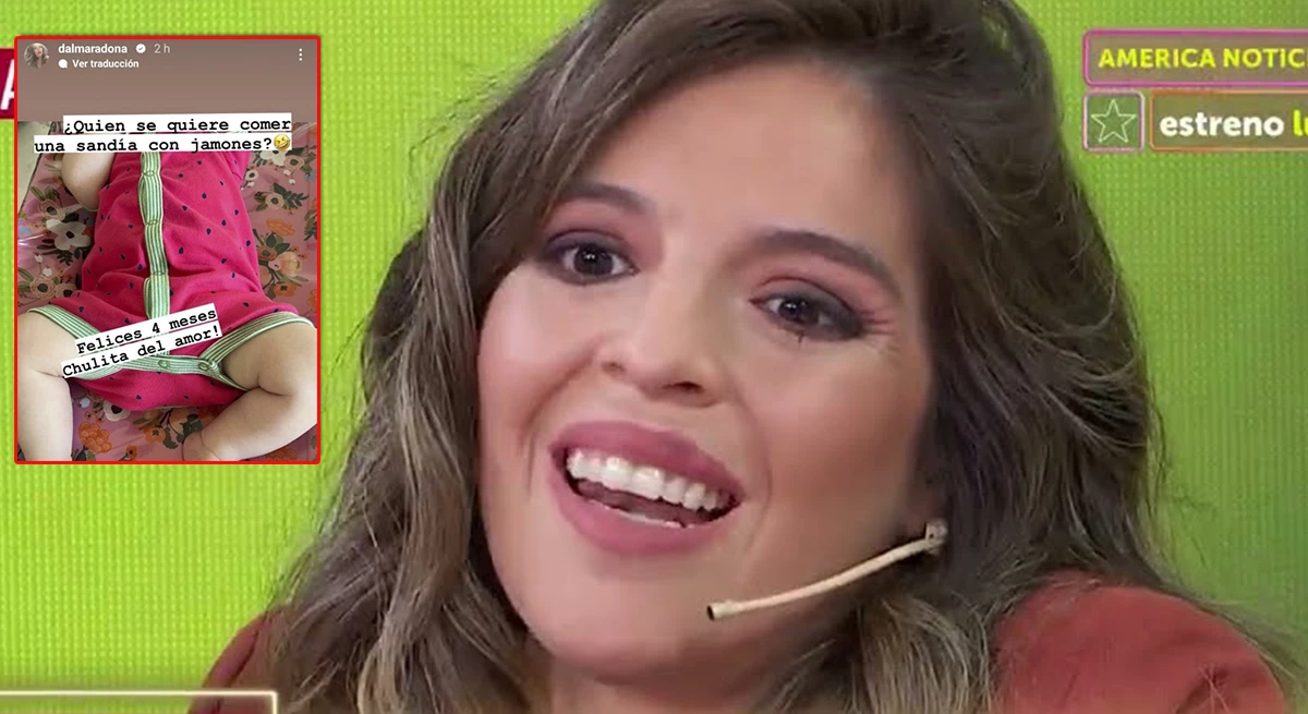 Y ahora, para celebrar la llegada de los cuatro meses de Azul, Maradona, que siempre fue "celosa" de resguardar la carita de sus hijos, compartió una dulce postal en sus redes sociales. En la foto se ve el cuerpito de la baby con un enterito en colorado con detalles en negro. "¿Quién quiere comer una sandía con jamones?", escribió, junto a la amorosa postal.
