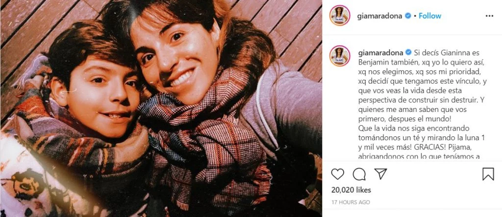 Luego, Gianinna compartió una foto abrazada a Benjamín en el que dejó en claro que, a diferencia del Kun, ella siempre ubicaba a su hijo en el primer lugar. "Si decís Gianinna decis Benjamín también", aseguró.